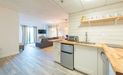 Unit setup: Queen bed, sleeper sofa (best for kids/shorter adults), 55" smart TV, full bathroom with walk-in shower, kitchenette with 2-burner induction cooktop, countertop oven, microwave, fridge, and coffee maker.